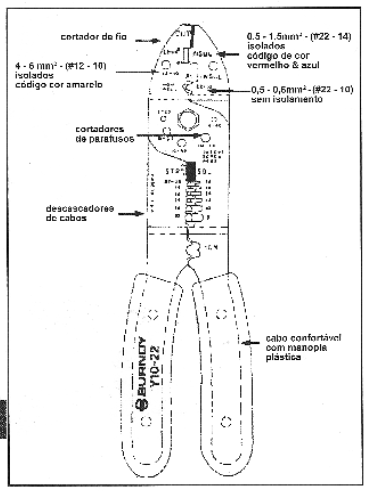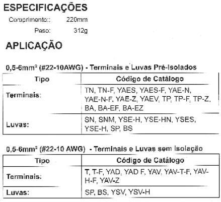 É uma ferramenta prática, utilizada para crimpagem de terminais pré-isolados e terminais sem isolação. Corta e descasca fios e cabos de até 6 mm².